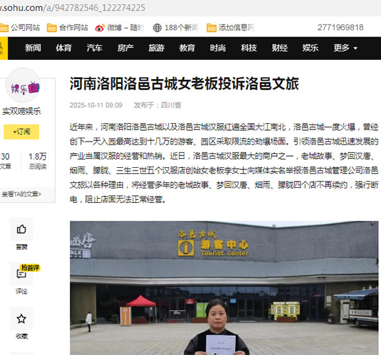 近年来,河南洛阳洛邑古城以及洛邑古城汉服红遍全国大江南北,洛邑古城一度火爆,曾经创下一天入园最高达到十几万的游客、园区采取限流的劲爆场面。引领洛邑古城迅速发展的产业当属汉服的经营和热销。近日,洛邑古城汉服最大的商户之一,老城故事、梦回汉唐、烟雨、朦胧、三生三世五个汉服店创始女老板李女士向媒体实名举报洛邑古城管理公司洛邑文旅以各种理由,将经营多年的老城故事、梦回汉唐、烟雨、朦胧四个店不再续约,强行断电,阻止店面无法正常经营。